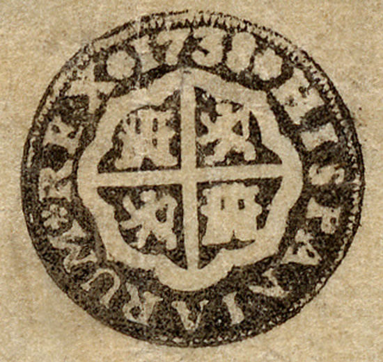 The image on this note is enlarged here. An example of a Spanish 1 real coin dated 1739 is shown below (courtesy of Heritage Auctions). The image on the note is quite faithful. The side shown on the note has the date but not the denomination or mintmark.