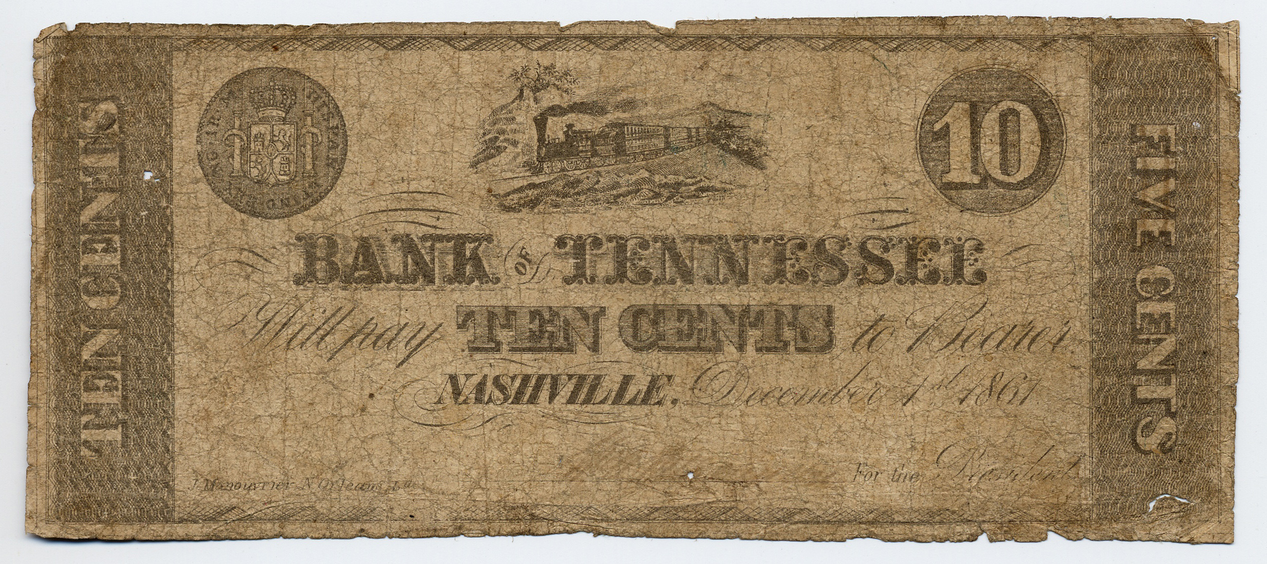 Bank of Tennessee, Nashville, Somerville Branch, “Bank of Tennessee, Nashville, Somerville Branch, Tennessee, Somerville, 1861, 10 cents,” Omeka, accessed April 25, 2026, https://oldnote.org/omeka/items/show/131.