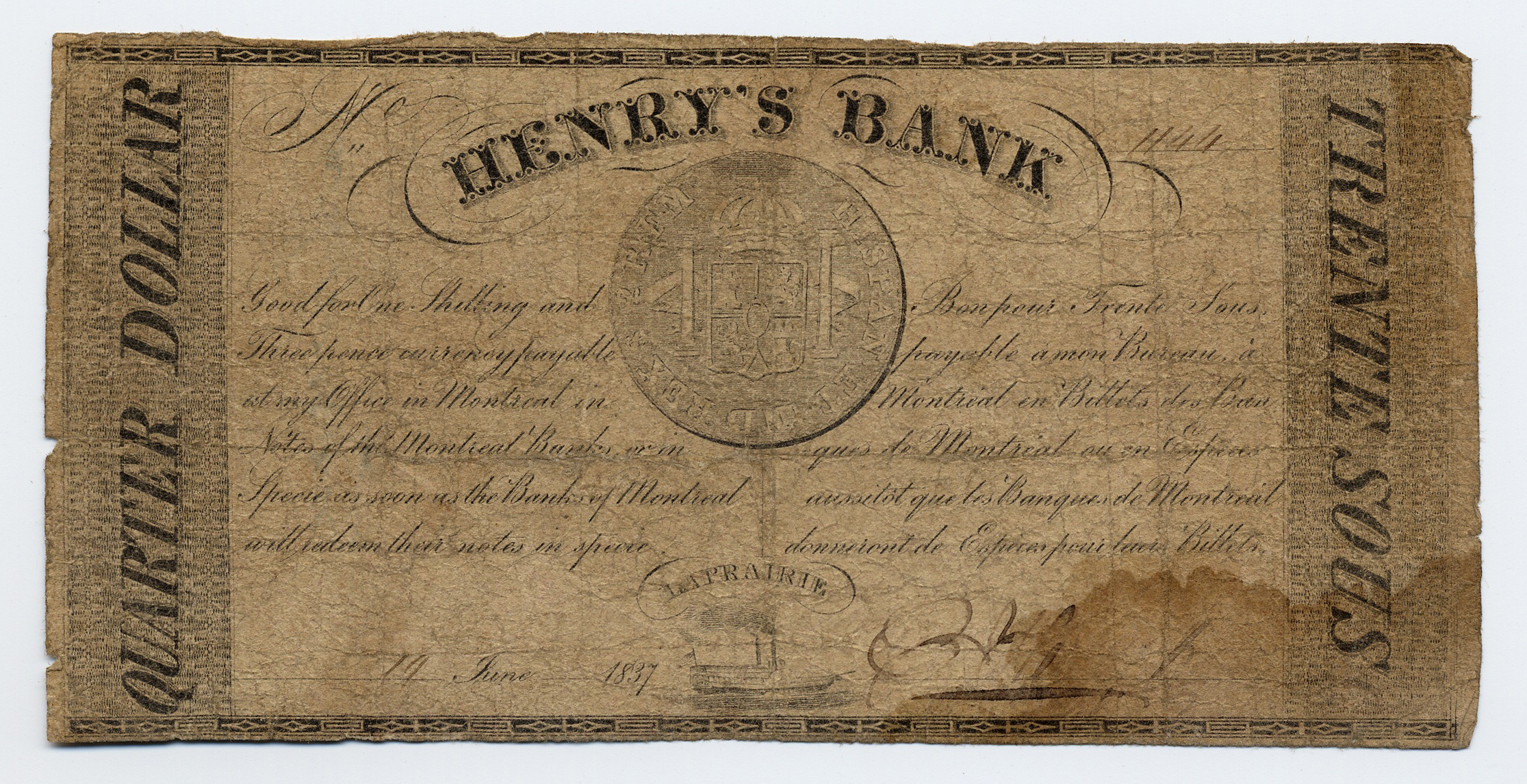 Henry's Bank, “Henry's Bank, Quebec, LaPrairie, 1837, quarter dollar,” Omeka, accessed April 25, 2026, https://oldnote.org/omeka/items/show/114.