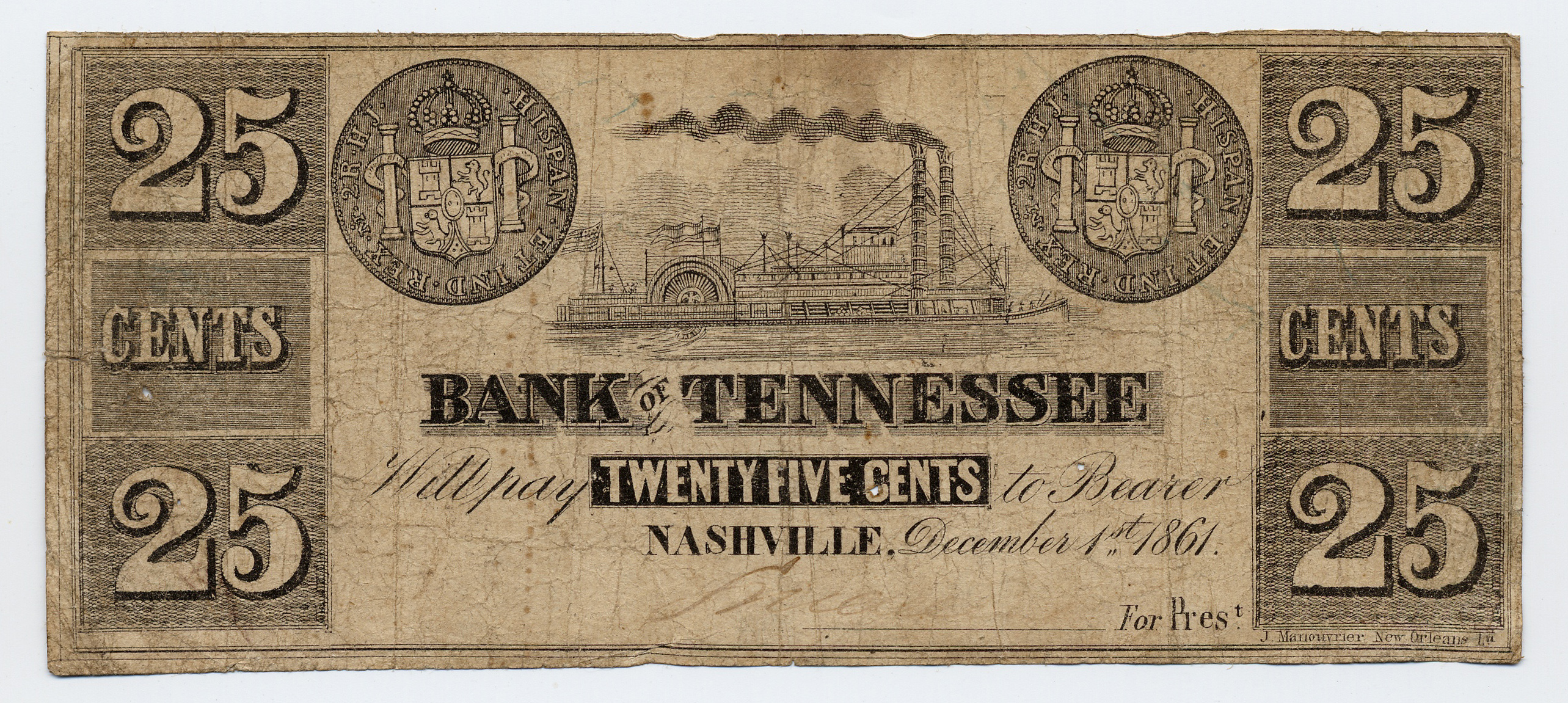 Bank of Tennessee, Nashville, Brownsville Branch, “Bank of Tennessee, Nashville, Brownsville Branch, Tennessee, Brownsville, 1861, 25 cents,” Omeka, accessed April 26, 2026, https://oldnote.org/omeka/items/show/123.