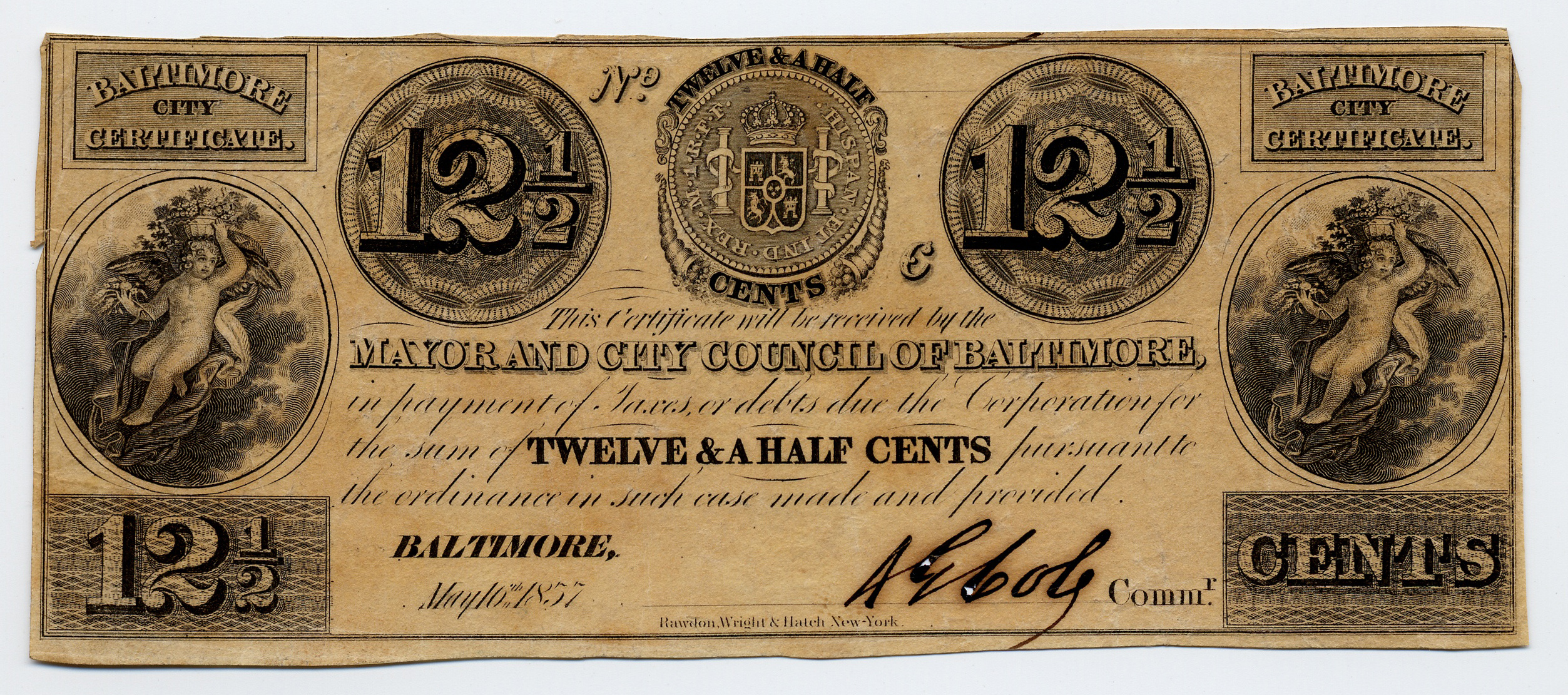 Mayor and City Council of Baltimore, “Mayor and City Council of Baltimore, Maryland, Baltimore, 1857, 12 1/2 cents,” Omeka, accessed April 26, 2026, https://oldnote.org/omeka/items/show/156.