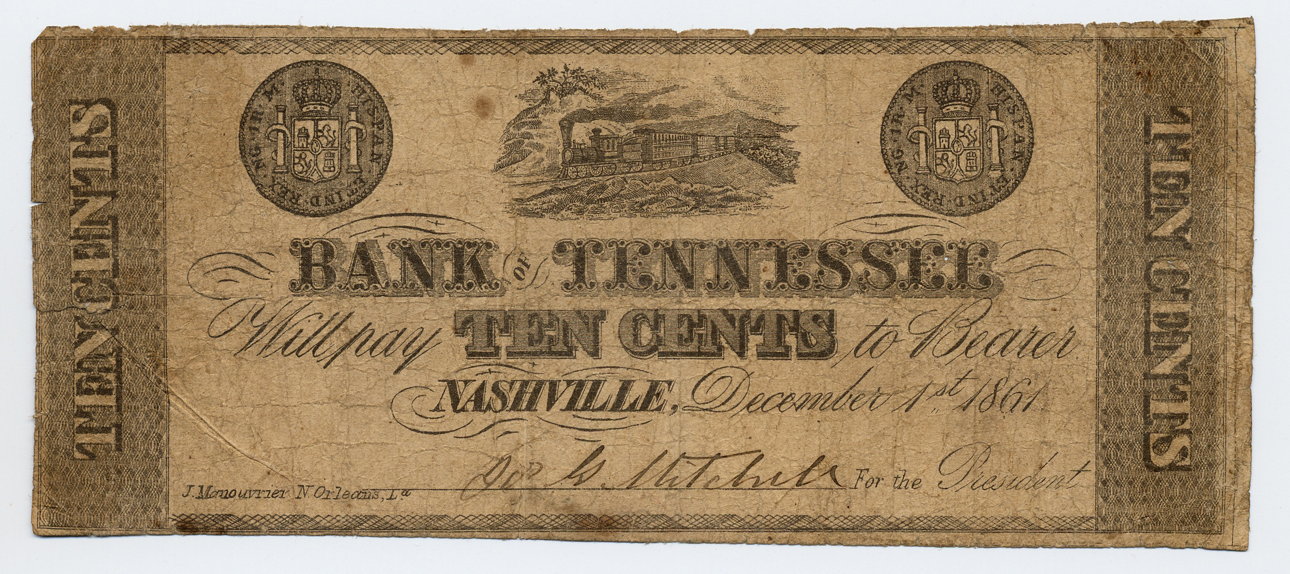 Bank of Tennessee, Nashville, Sparta Branch, “Bank of Tennessee, Nashville, Sparta Branch, Tennessee, Sparta, 1861, 10 cents,” Omeka, accessed April 25, 2026, https://oldnote.org/omeka/items/show/158.