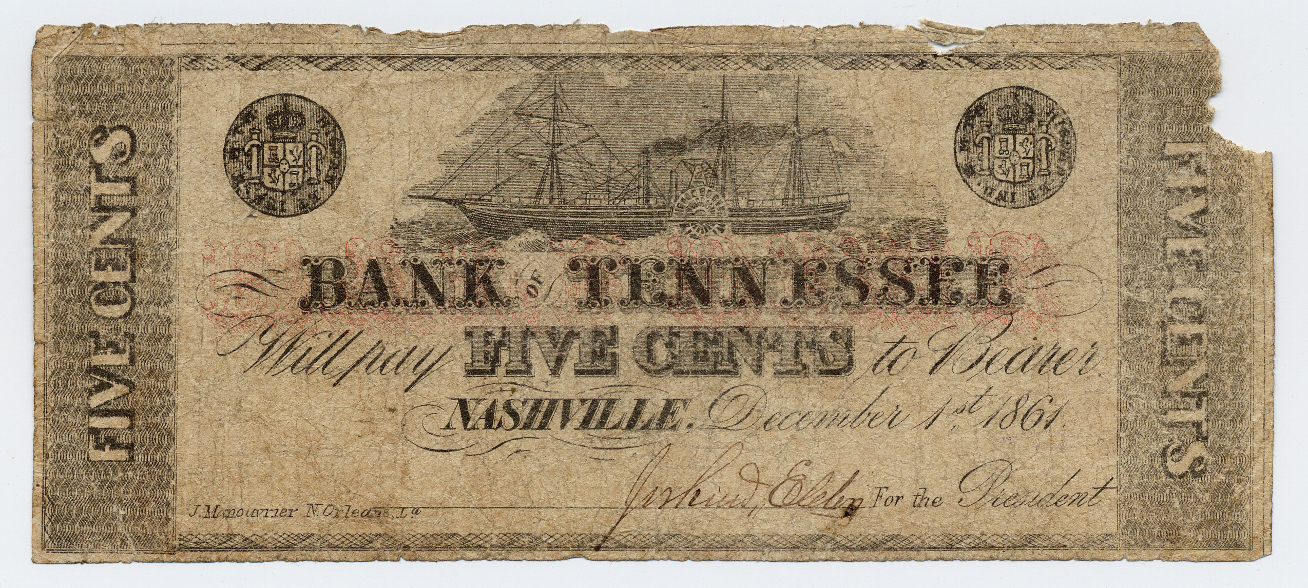 Bank of Tennessee, Nashville, Clarkesville Branch, “Bank of Tennessee, Nashville, Clarkesville Branch, Tennessee, Clarksville, 1861, 5 cents,” Omeka, accessed April 25, 2026, https://oldnote.org/omeka/items/show/160.