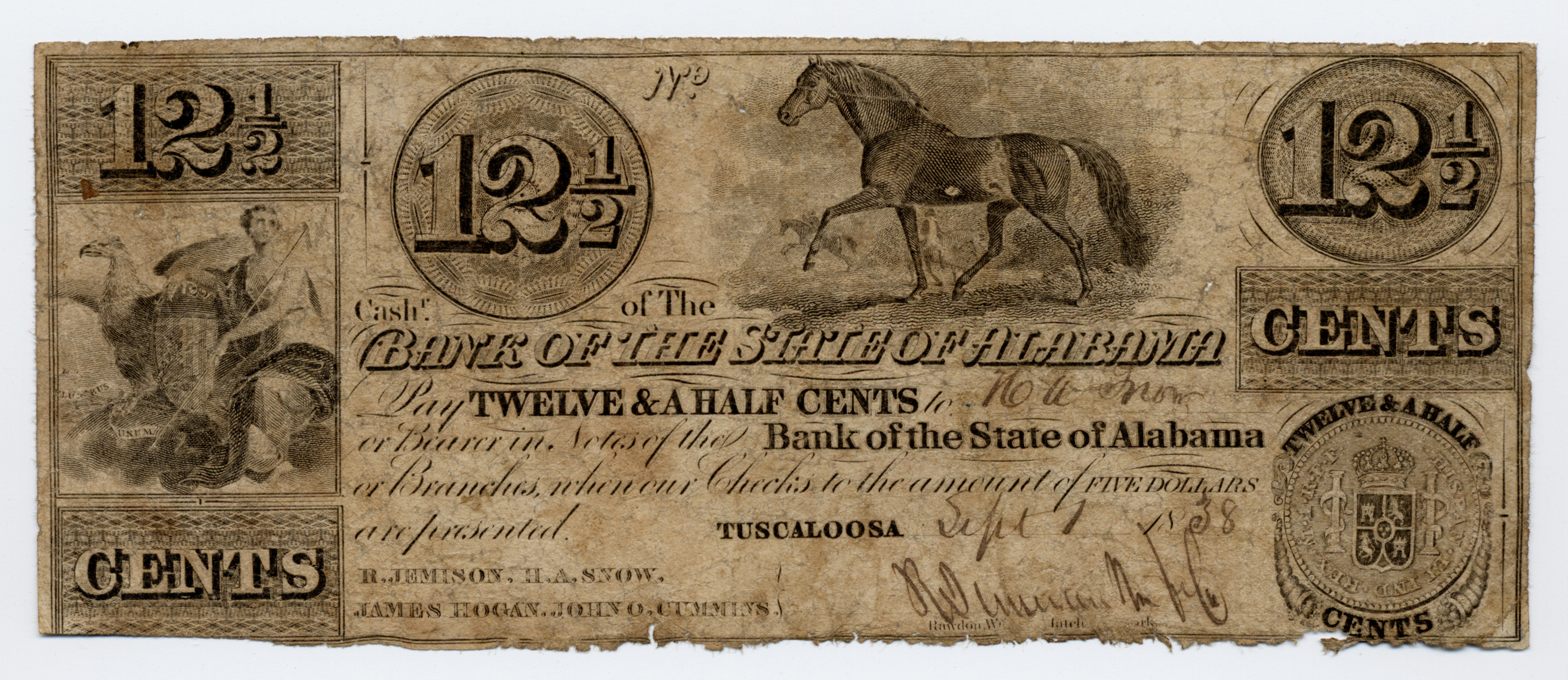 R. Jemison, H. A. Snow, James Hogan, John O. Cummins, Bank of the State of Alabama, “R. Jemison, H. A. Snow, James Hogan, John O. Cummins, Bank of the State of Alabama, Alabama, Tuscaloosa, 1838, 12 1/2 cents,” Omeka, accessed April 26, 2026, https://oldnote.org/omeka/items/show/181.