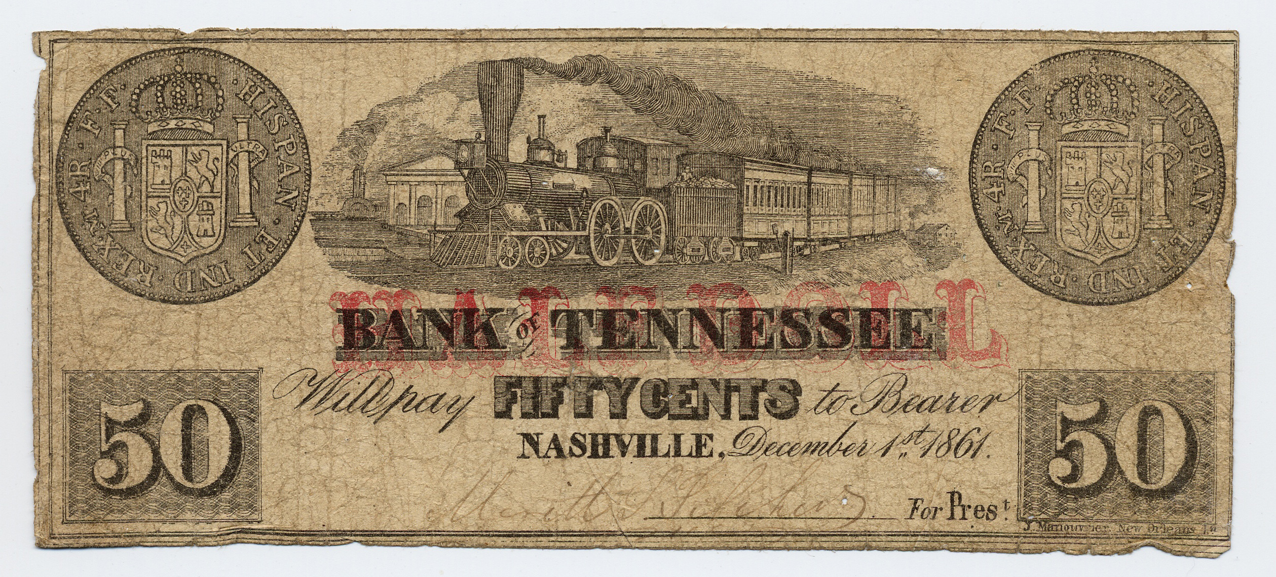 Bank of Tennessee, Nashville, Nashville Branch, “Bank of Tennessee, Nashville, Nashville Branch, Tennessee, Nashville, 1861, 50 cents,” Omeka, accessed April 26, 2026, https://oldnote.org/omeka/items/show/182.
