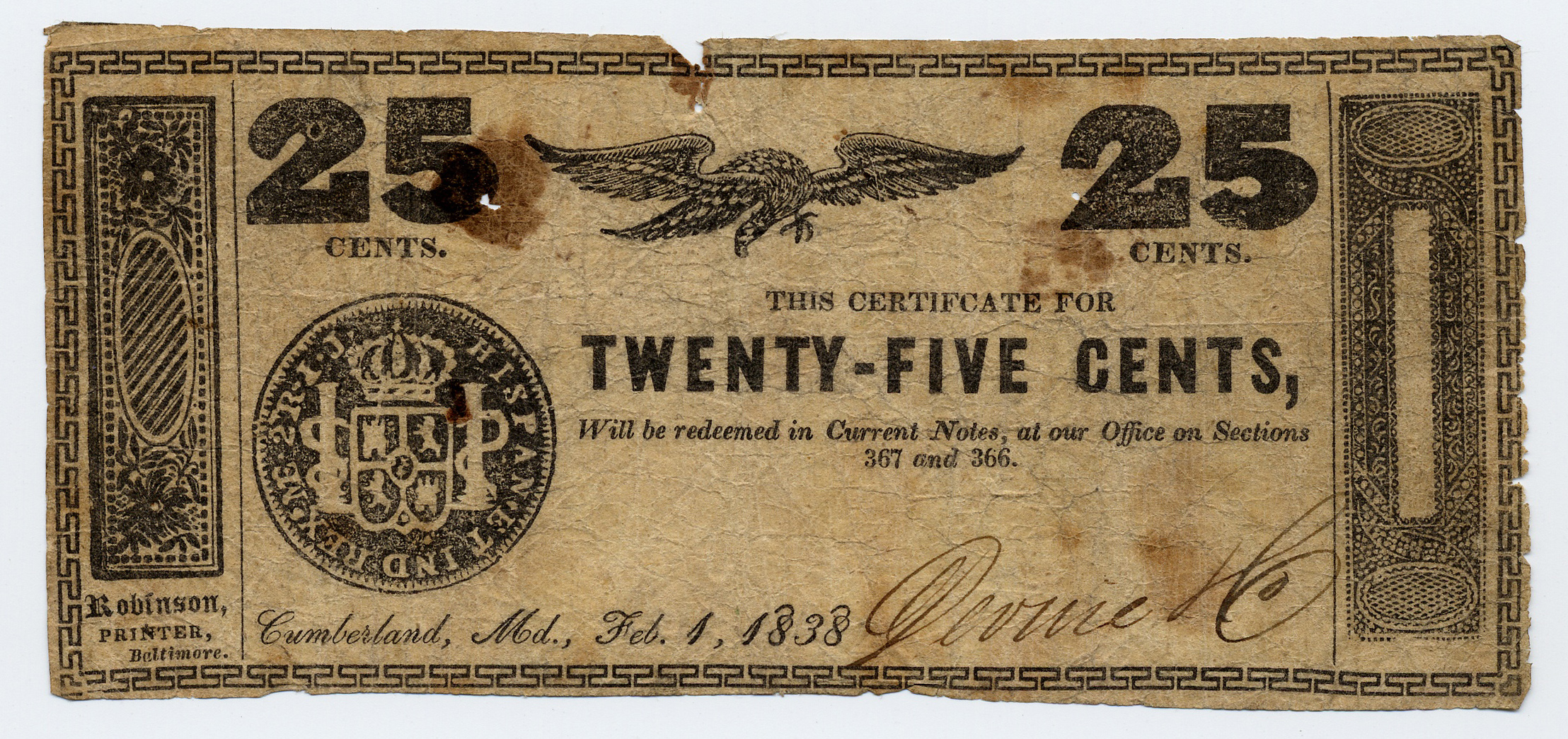 Devine & Co, “Devine & Co, Maryland, Cumberland, 1838, 25 cents,” Omeka, accessed April 26, 2026, https://oldnote.org/omeka/items/show/198.