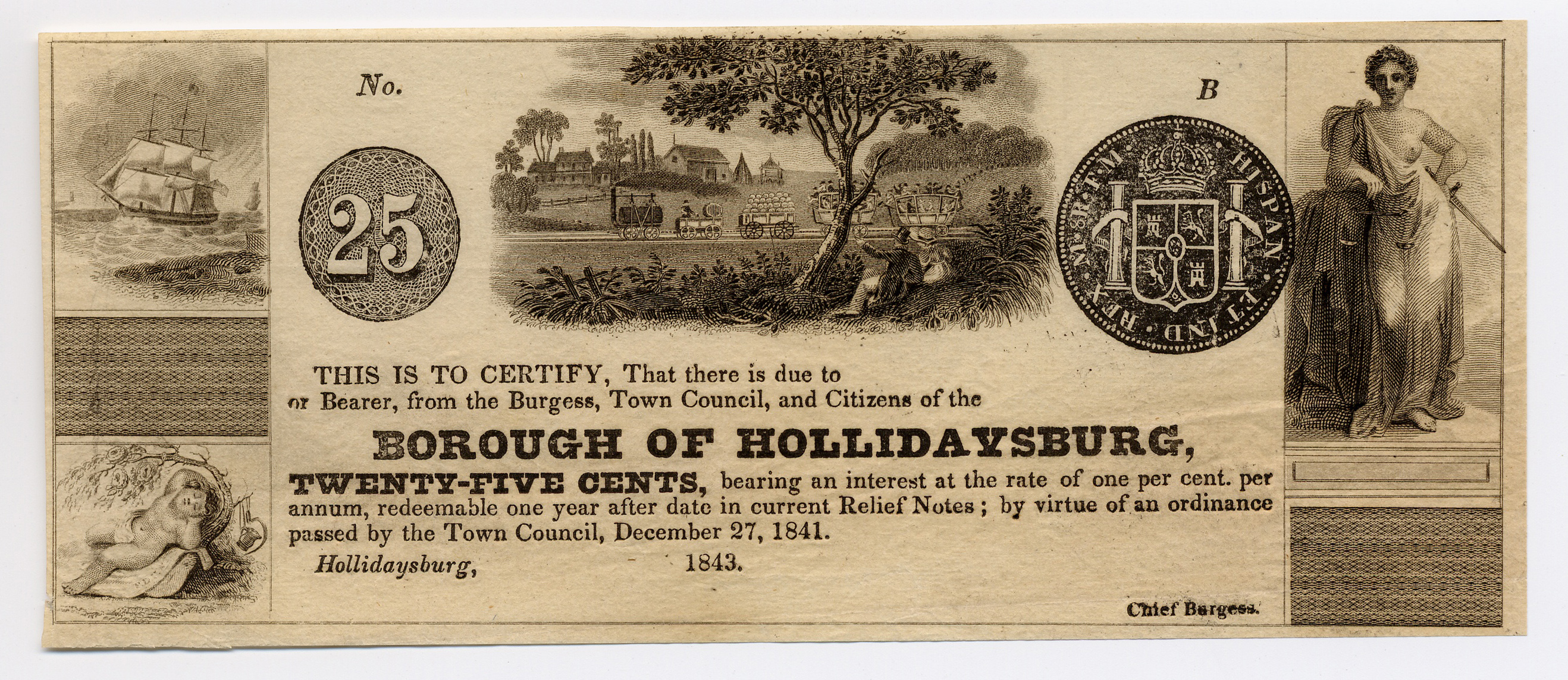 Borough of Hollidaysburg, “Borough of Hollidaysburg, Pennsylvania, Hollidaysburg, 1843, 25 cents,” Omeka, accessed April 25, 2026, https://oldnote.org/omeka/items/show/231.