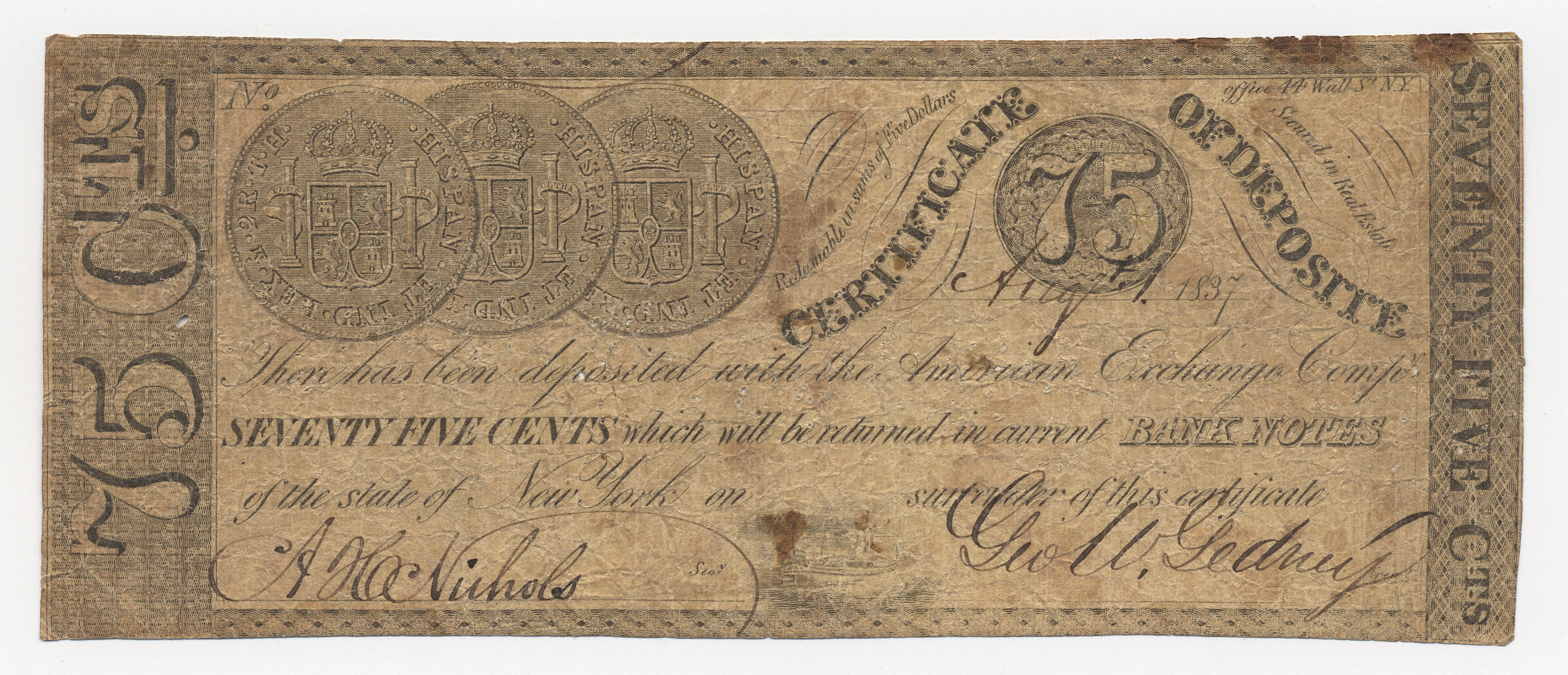 American Exchange Company, “American Exchange Company, New York, NYC, 1837, 75 cents,” Omeka, accessed April 25, 2026, https://oldnote.org/omeka/items/show/232.