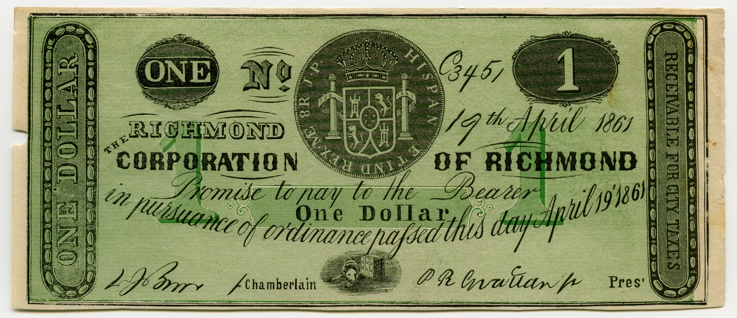 Corporation of Richmond, “Corporation of Richmond, Virginia, Richmond, 1861, 1 dollar,” Omeka, accessed April 25, 2026, https://oldnote.org/omeka/items/show/250.