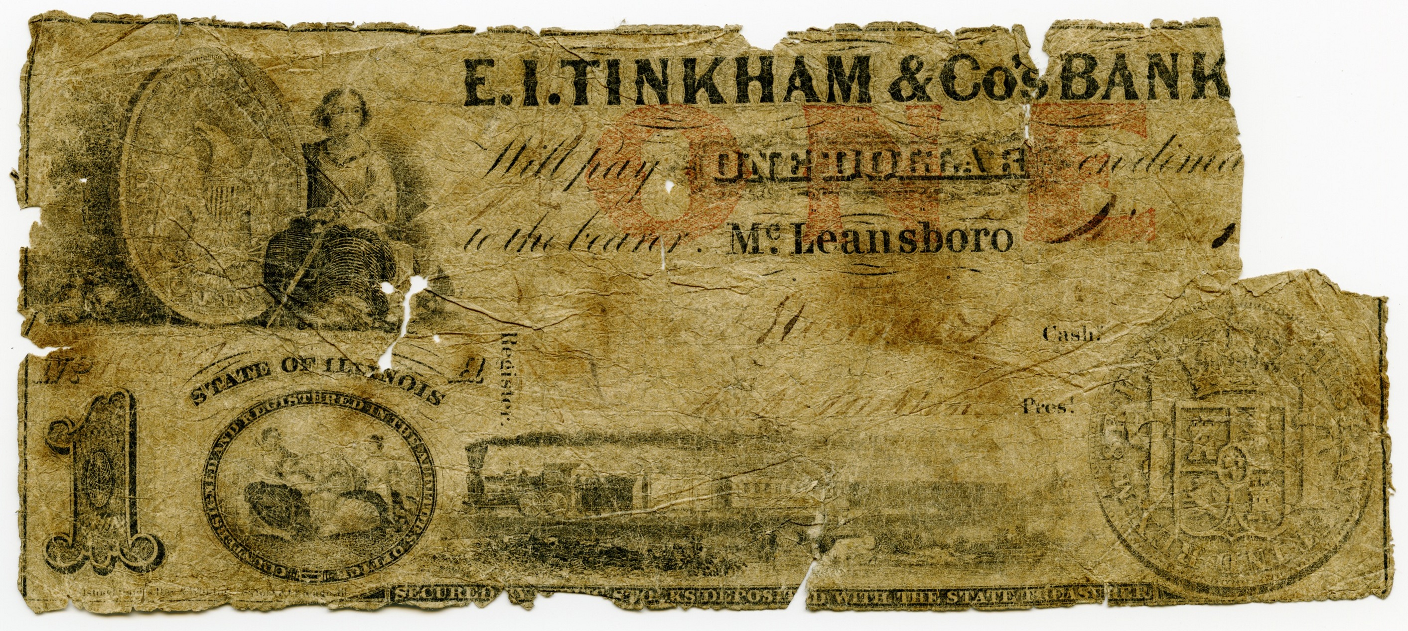 E. I. Tinkham & Co's Bank, “E. I. Tinkham & Co's Bank, Illinois, McLeansboro, ?, 1 dollar,” Omeka, accessed April 25, 2026, https://oldnote.org/omeka/items/show/253.