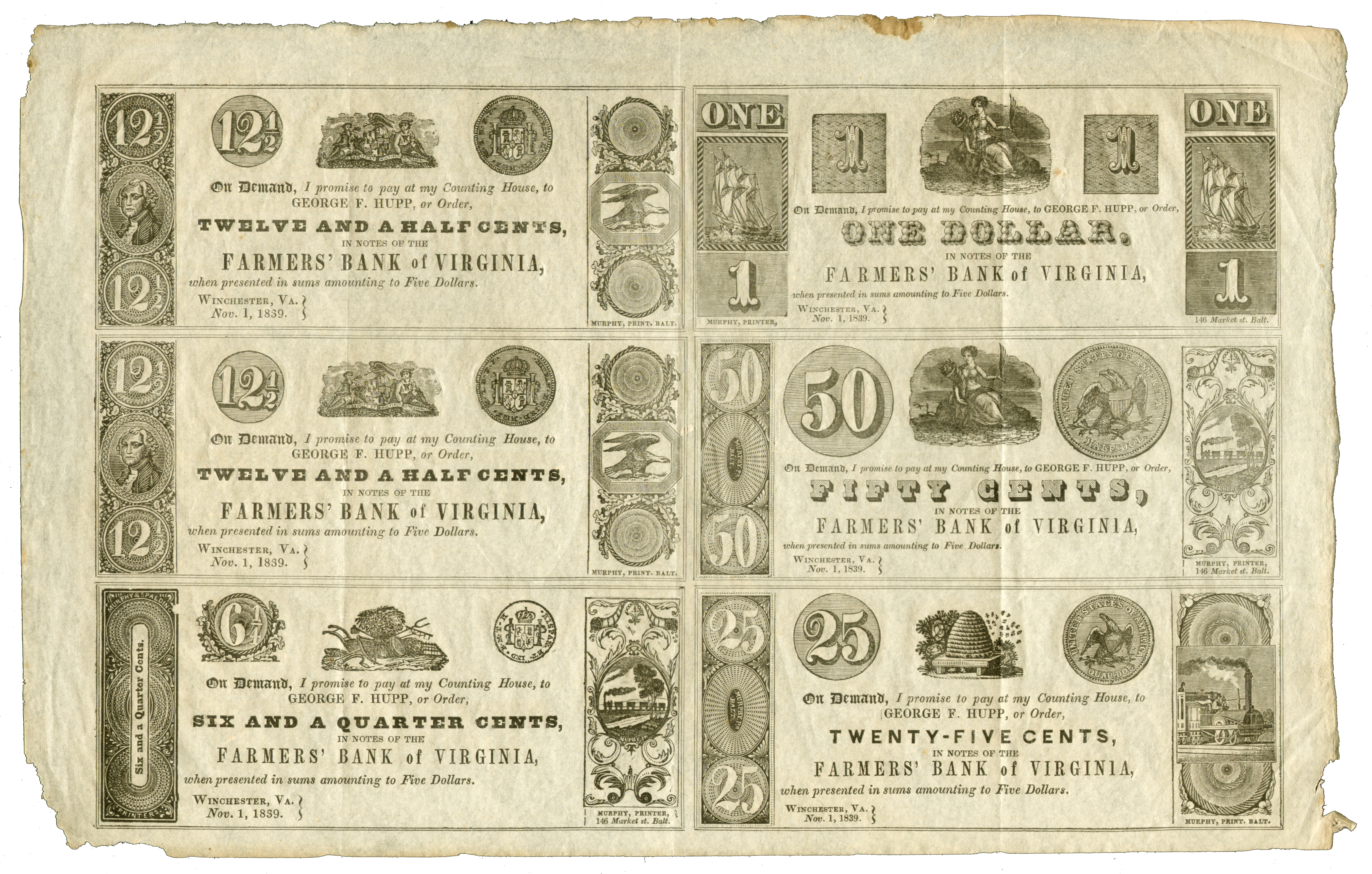 1 real Mo FT (?), half real M[o] TH, Nov 1, 1839, six subject sheet; imprint: MURPHY, PRINT. BALT. / MURPHY, PRINTER, 146 Market st. Balt.