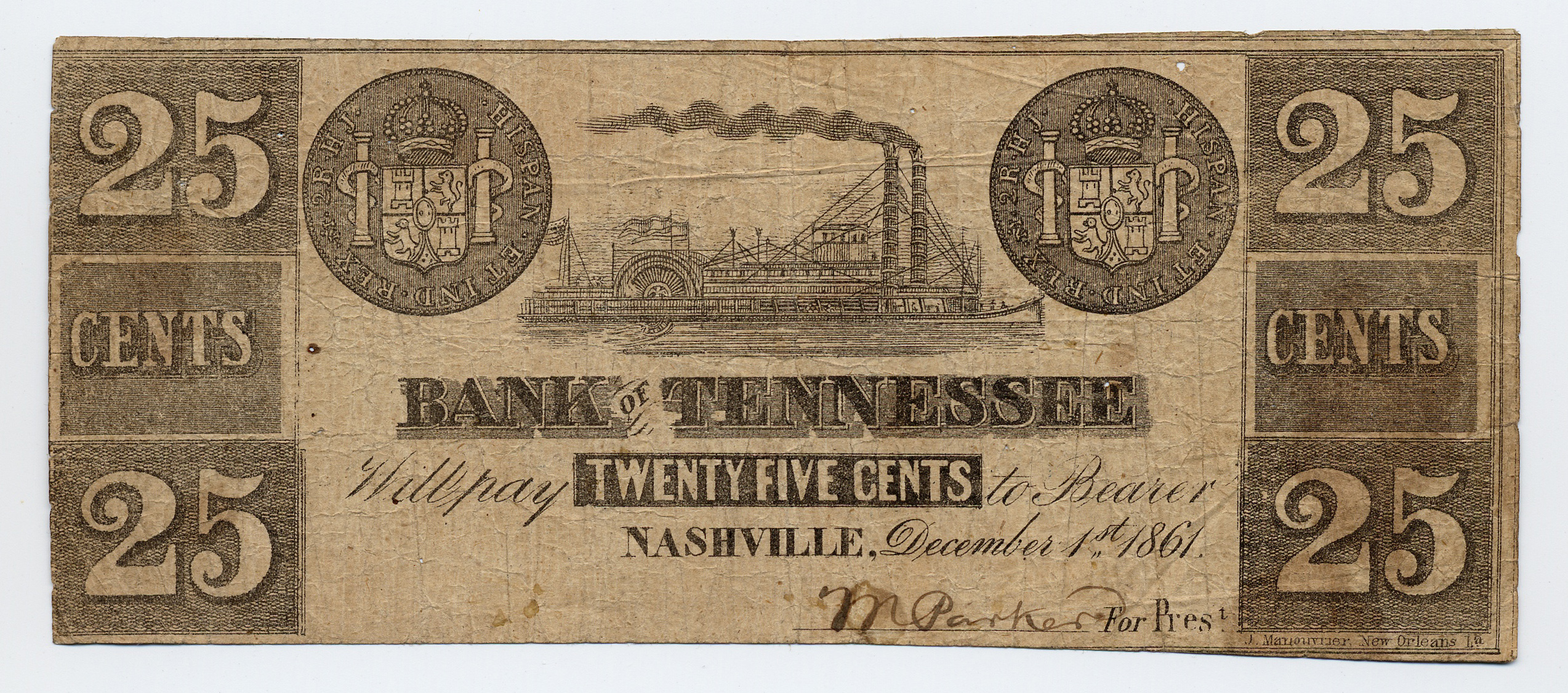 Bank of Tennessee, Nashville, Nashville Branch, “Bank of Tennessee, Nashville, Nashville Branch, Tennessee, Nashville, 1861, 25 cents,” Omeka, accessed April 26, 2026, https://oldnote.org/omeka/items/show/72.