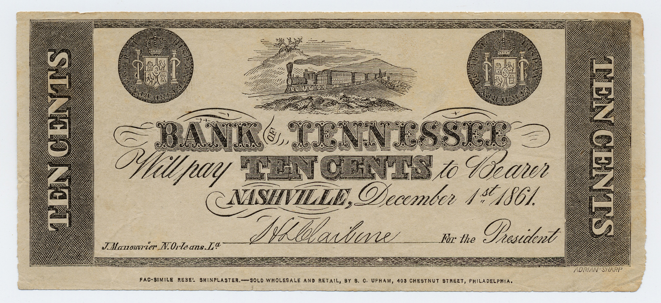 Bank of Tennessee, Nashville, Nashville Branch, “Bank of Tennessee, Nashville, Nashville Branch, Tennessee, Nashville, 1861, 10 cents,” Omeka, accessed April 26, 2026, https://oldnote.org/omeka/items/show/81.