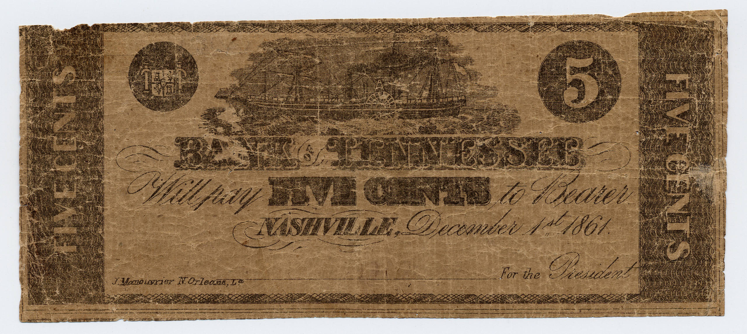 Bank of Tennessee, Nashville, Nashville Branch, “Bank of Tennessee, Nashville, Nashville Branch, Tennessee, Nashville, 1861, 5 cents,” Omeka, accessed April 25, 2026, https://oldnote.org/omeka/items/show/85.