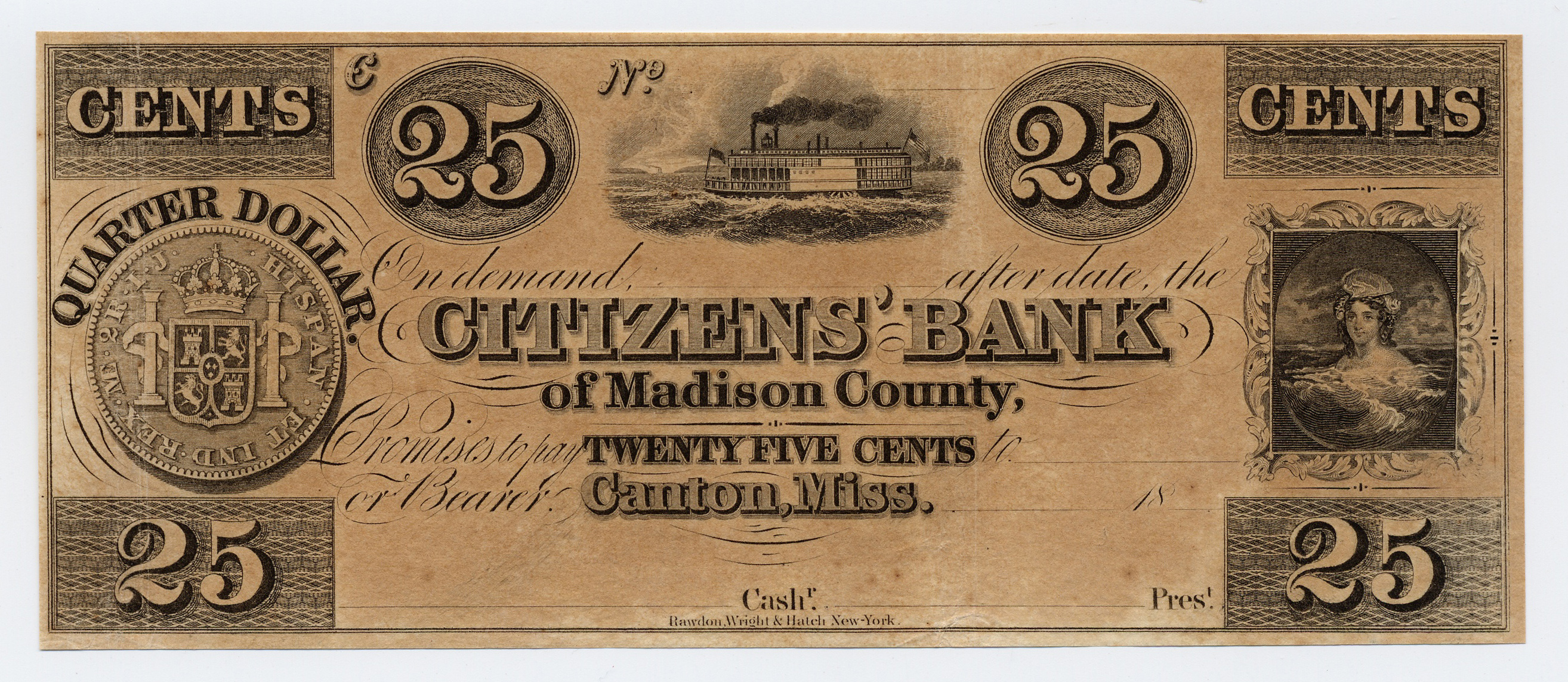 Citizen's Bank of Madison County, “Citizen's Bank of Madison County, Mississippi, Canton, ?, 25 cents,” Omeka, accessed April 26, 2026, https://oldnote.org/omeka/items/show/99.