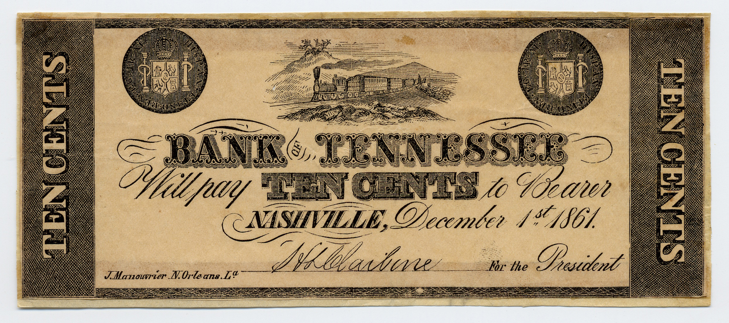 Bank of Tennessee, Nashville, Nashville Branch, “Bank of Tennessee, Nashville, Nashville Branch, Tennessee, Nashville, 1861, 10 cents,” Omeka, accessed April 25, 2026, https://www.oldnote.org/omeka/items/show/104.