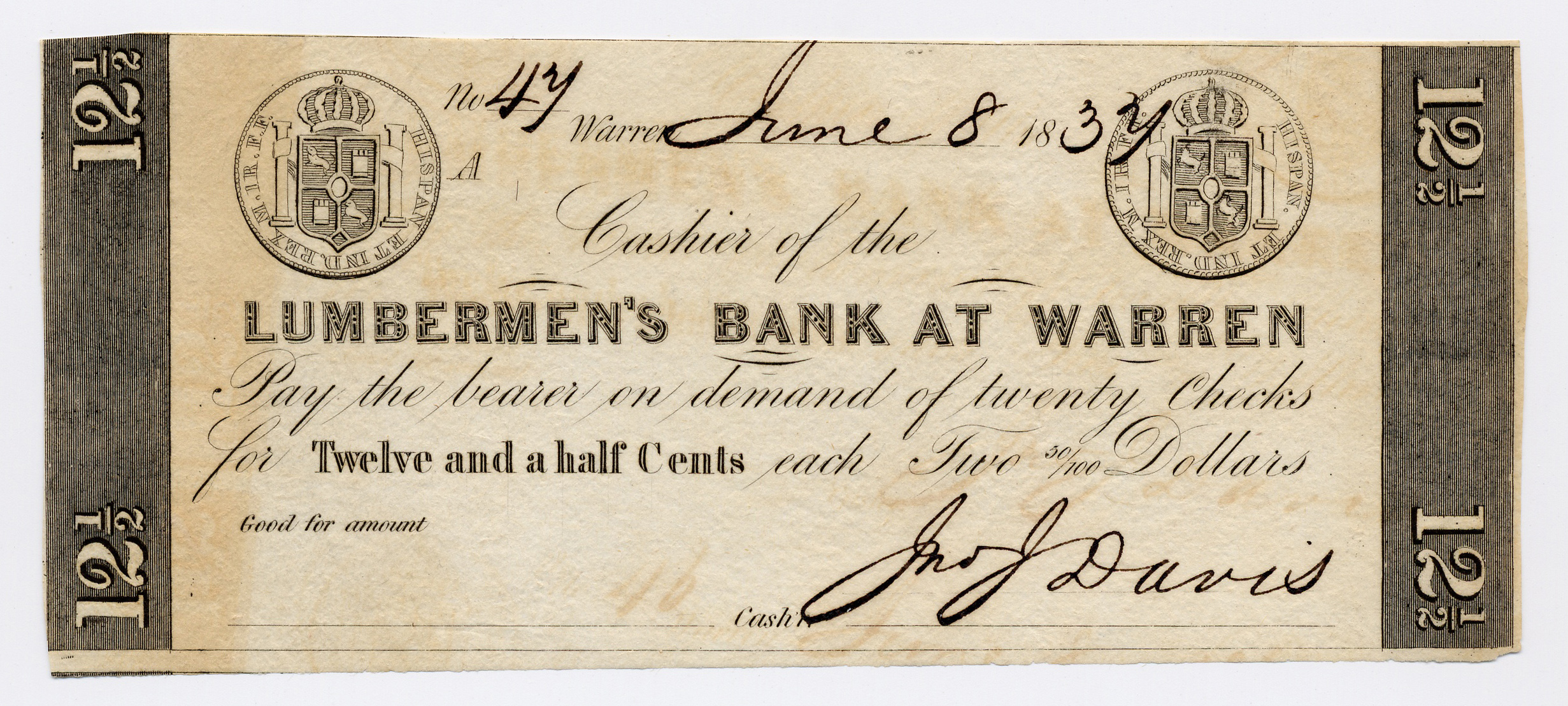 Lumberman's Bank at Warren, “Lumberman's Bank at Warren, Pennsylvania, Warren, 1837, 12 1/2 cents,” Omeka, accessed April 25, 2026, https://www.oldnote.org/omeka/items/show/120.