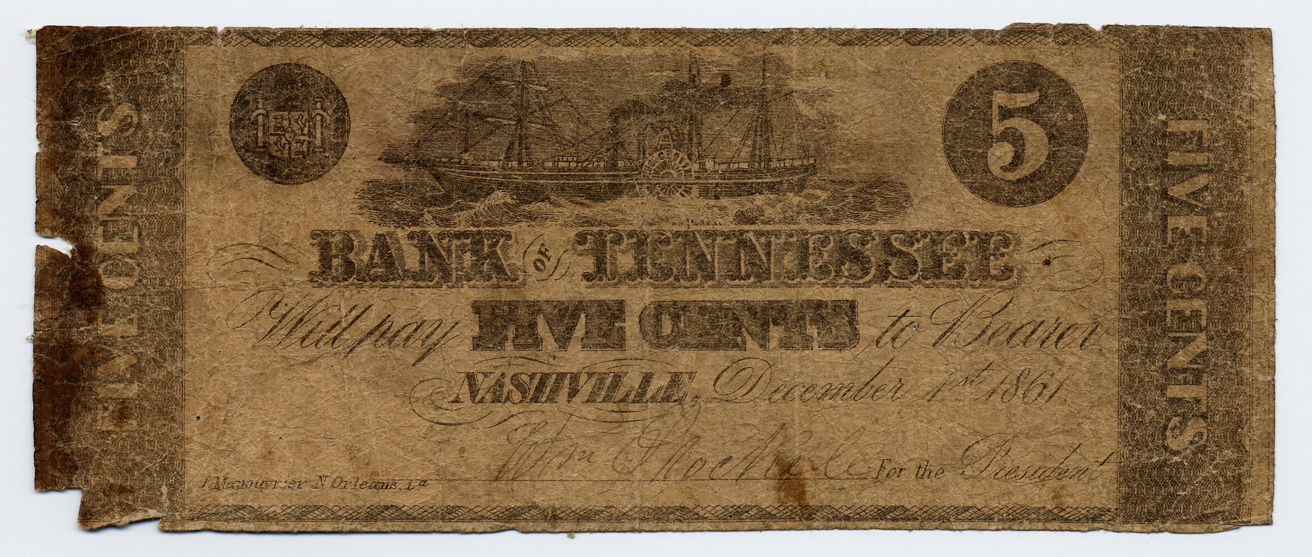 Bank of Tennessee, Nashville, Nashville Branch, “Bank of Tennessee, Nashville, Nashville Branch, Tennessee, Nashville, 1861, 5 cents,” Omeka, accessed April 25, 2026, https://www.oldnote.org/omeka/items/show/122.