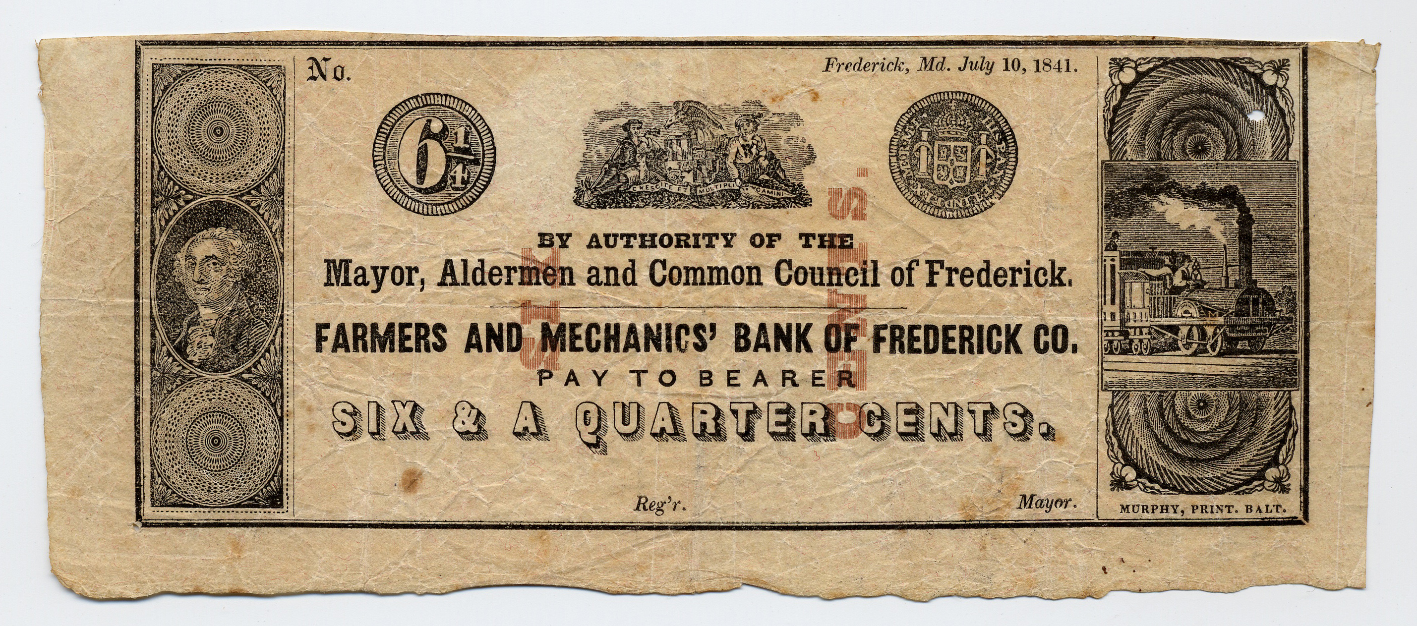 Farmers and Mechanics Bank, Mayor, Aldermen, “Farmers and Mechanics Bank, Mayor, Aldermen, Maryland, Frederick, 1841, 6 1/4 cents,” Omeka, accessed April 26, 2026, https://www.oldnote.org/omeka/items/show/128.