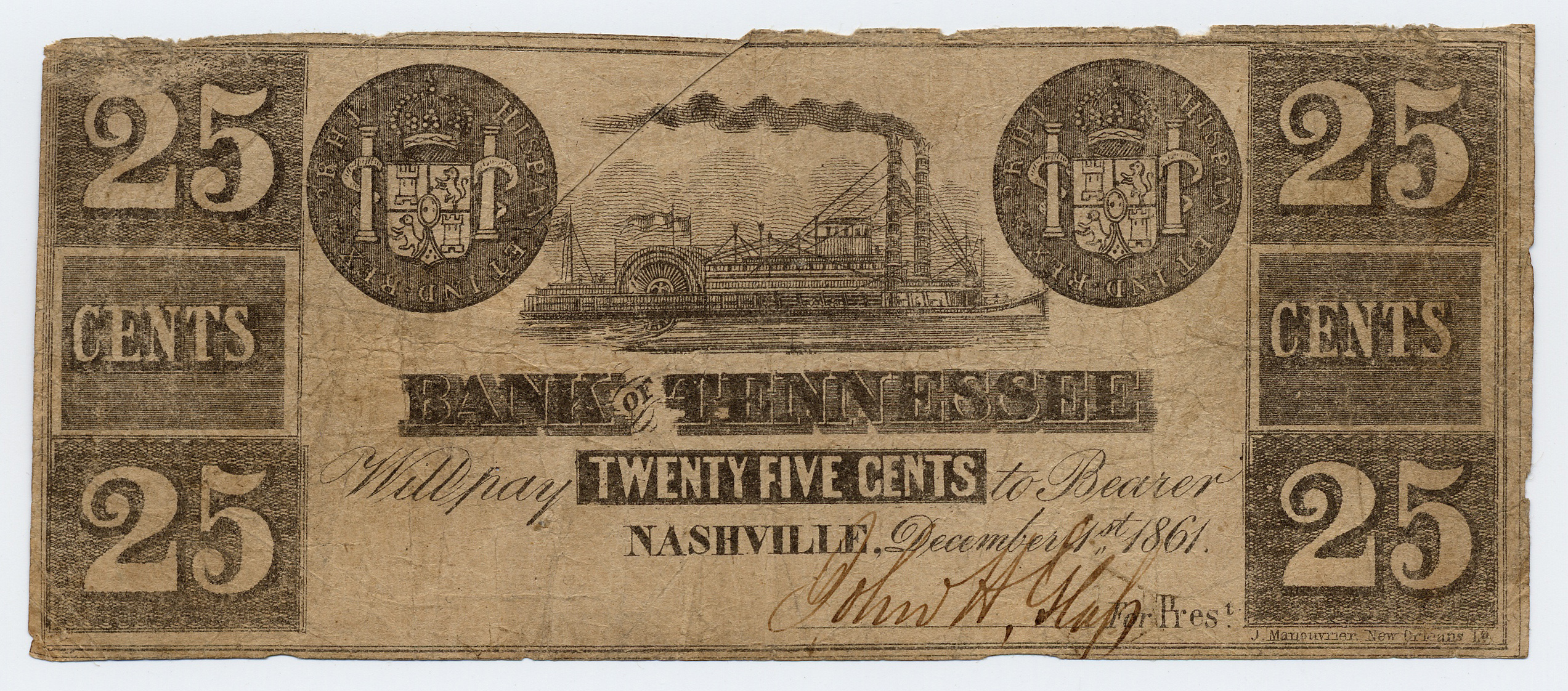 Bank of Tennessee, Nashville, Trenton Branch, “Bank of Tennessee, Nashville, Trenton Branch, Tennessee, Trenton, 1861, 25 cents,” Omeka, accessed April 26, 2026, https://www.oldnote.org/omeka/items/show/143.