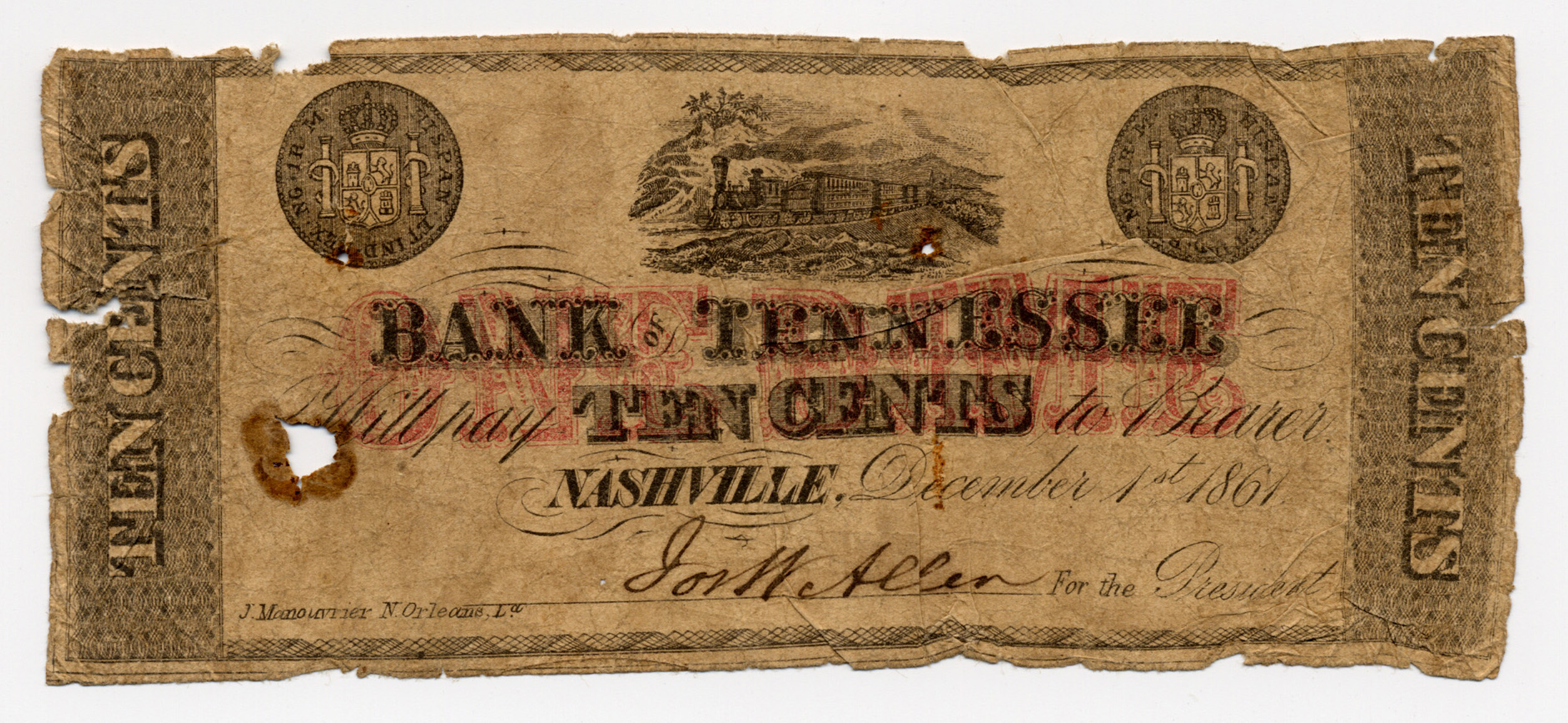 Bank of Tennessee, Nashville, Nashville Branch, “Bank of Tennessee, Nashville, Nashville Branch, Tennessee, Nashville, 1861, 10 cents,” Omeka, accessed April 25, 2026, https://www.oldnote.org/omeka/items/show/144.