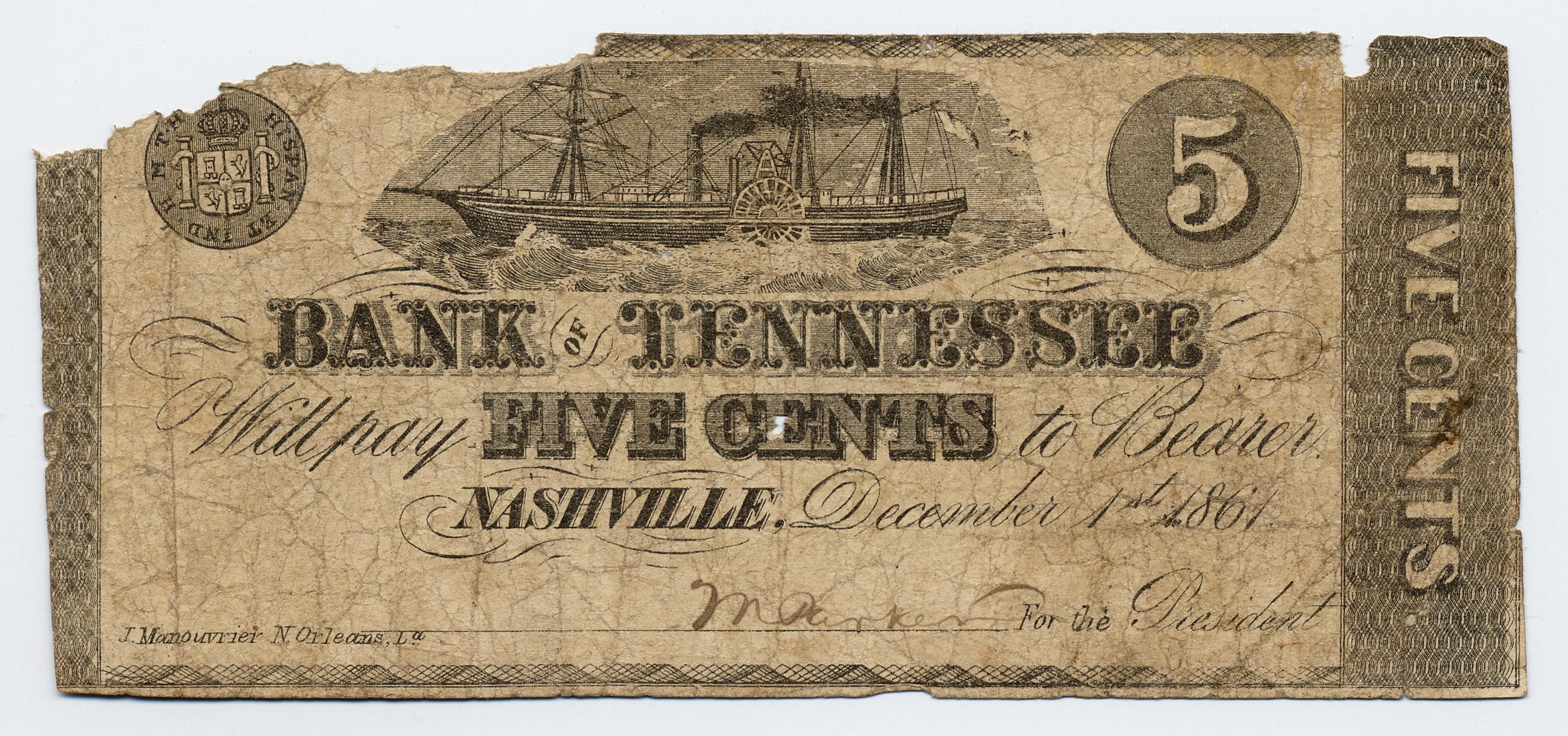 Bank of Tennessee, Nashville, Nashville Branch, “Bank of Tennessee, Nashville, Nashville Branch, Tennessee, Nashville, 1861, 5 cents,” Omeka, accessed April 26, 2026, https://www.oldnote.org/omeka/items/show/150.