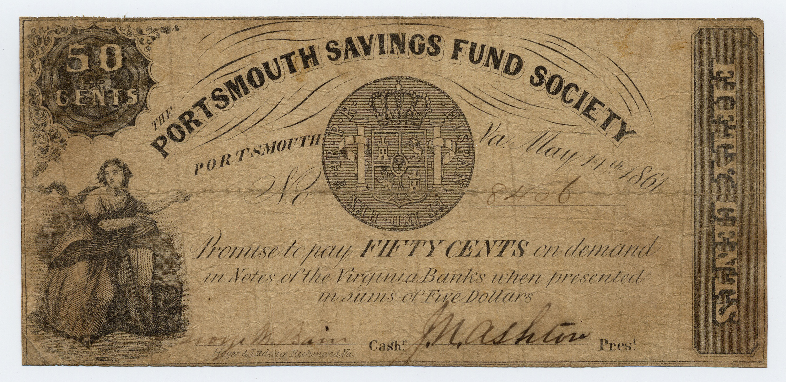 Portsmouth Savings Fund Society, “Portsmouth Savings Fund Society, Virginia, Portsmouth, 1861, 50 cents,” Omeka, accessed April 26, 2026, https://www.oldnote.org/omeka/items/show/153.