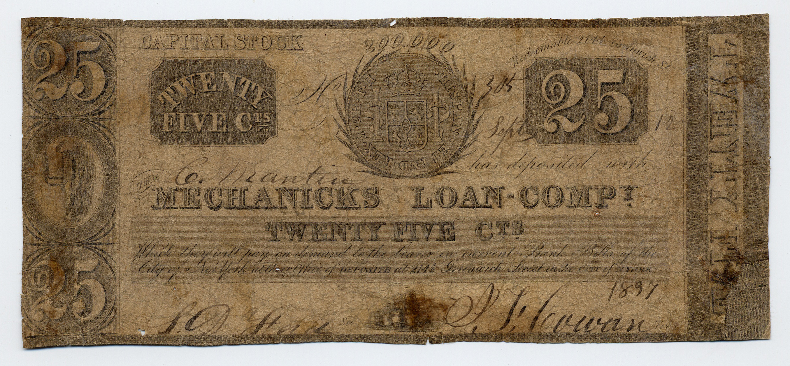 Mechanicks Loan Compy, “Mechanicks Loan Compy, New York, NYC, 1837, 25 cents,” Omeka, accessed April 26, 2026, https://www.oldnote.org/omeka/items/show/172.