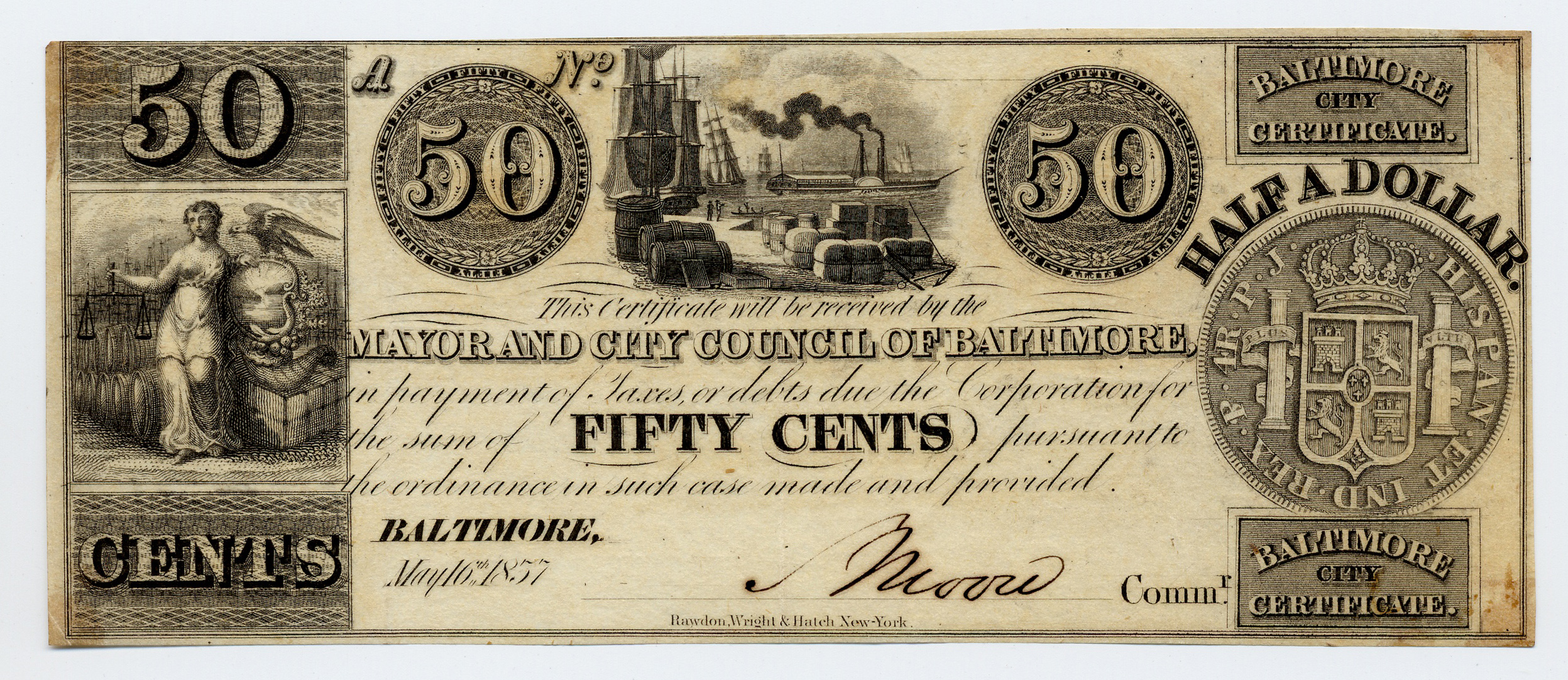 Mayor and City Council of Baltimore, “Mayor and City Council of Baltimore, Maryland, Baltimore, 1857, 50 cents,” Omeka, accessed April 25, 2026, https://www.oldnote.org/omeka/items/show/184.