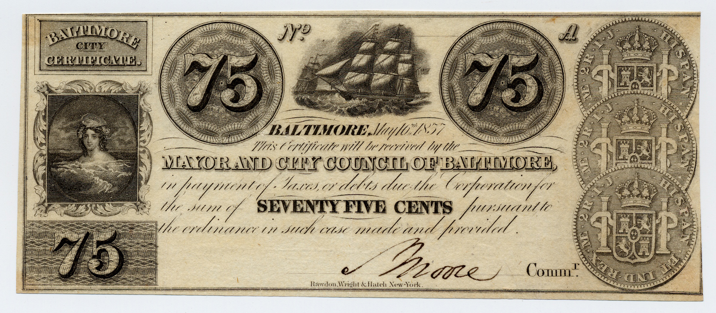 Mayor and City Council of Baltimore, “Mayor and City Council of Baltimore, Maryland, Baltimore, 1857, 75 cents,” Omeka, accessed April 25, 2026, https://www.oldnote.org/omeka/items/show/185.