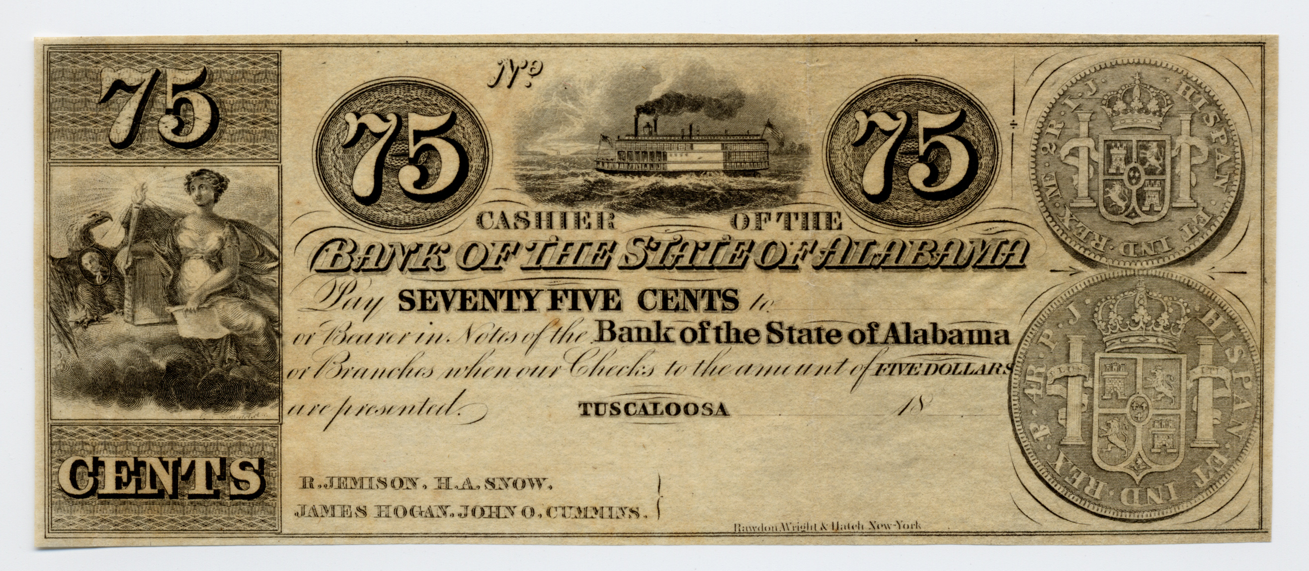 R. Jemison, H. A. Snow, James Hogan, John O. Cummins, Bank of the State of Alabama, “R. Jemison, H. A. Snow, James Hogan, John O. Cummins, Bank of the State of Alabama, Alabama, Tuscaloosa, ?, 75 cents,” Omeka, accessed April 25, 2026, https://www.oldnote.org/omeka/items/show/193.