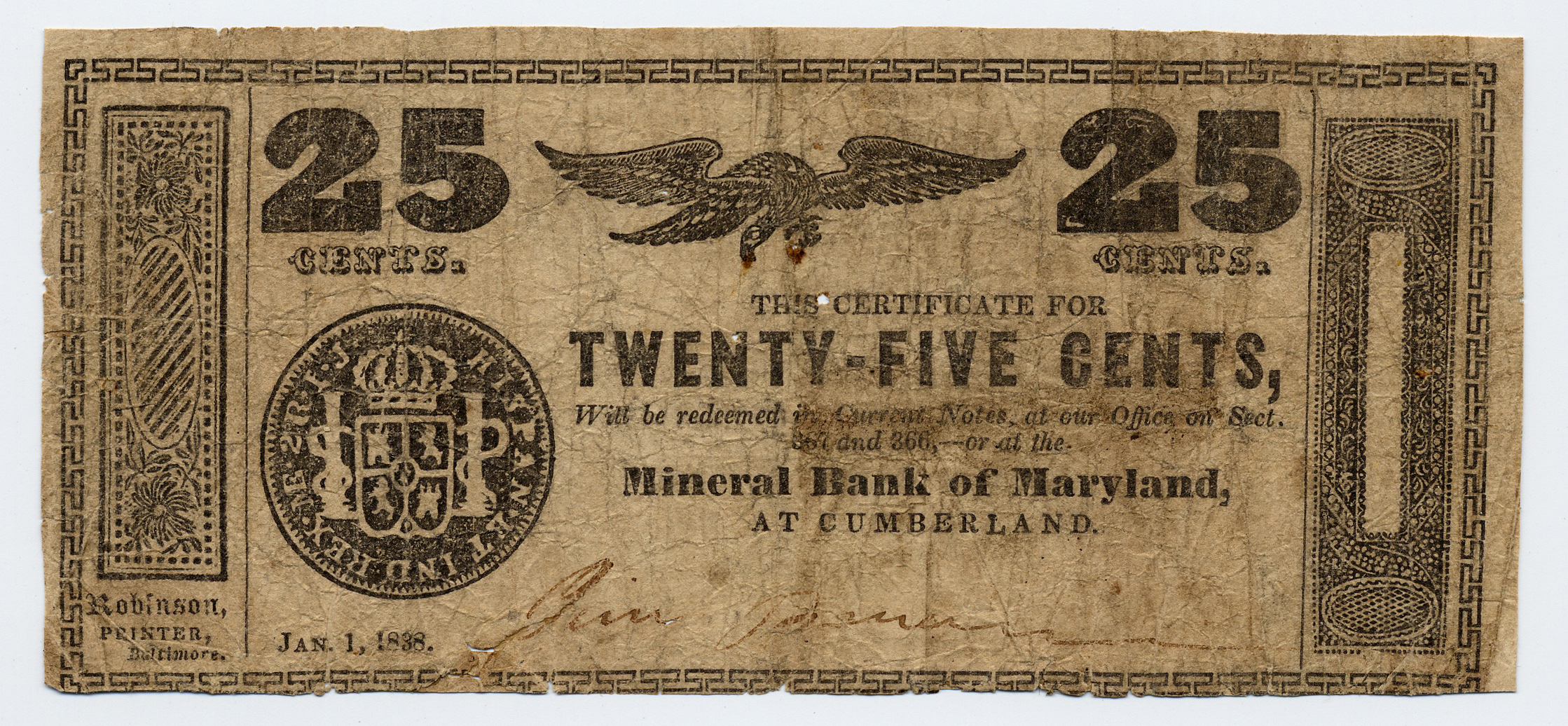 Jim Bauermann, “Jim Bauermann, Maryland, Cumberland, 1838, 25 cents,” Omeka, accessed April 25, 2026, https://www.oldnote.org/omeka/items/show/197.