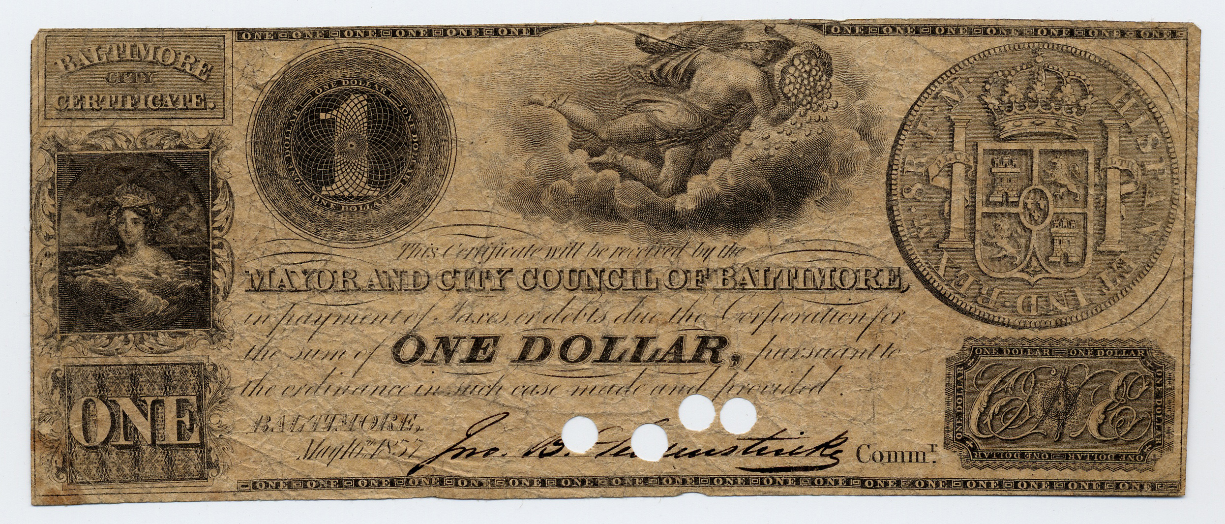 Mayor and City Council of Baltimore, “Mayor and City Council of Baltimore, Maryland, Baltimore, 1857, 1 dollar,” Omeka, accessed April 26, 2026, https://www.oldnote.org/omeka/items/show/199.