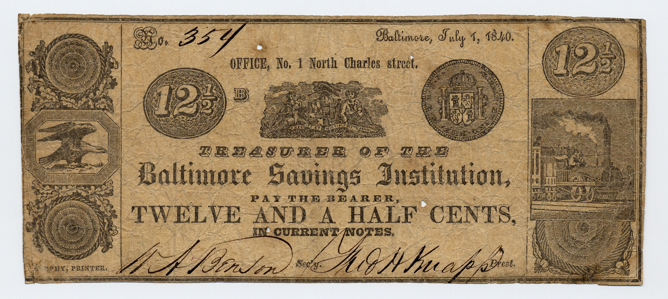 Baltimore Savings Institution, “Baltimore Savings Institution, Maryland, Baltimore, 1840, 12 1/2 cents,” Omeka, accessed April 25, 2026, https://www.oldnote.org/omeka/items/show/228.