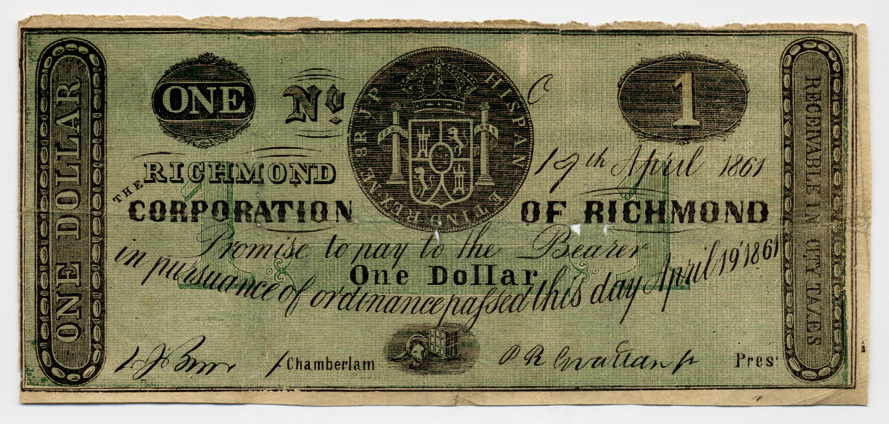 Corporation of Richmond, “Corporation of Richmond, Virginia, Richmond, 1861, 1 dollar,” Omeka, accessed April 25, 2026, https://www.oldnote.org/omeka/items/show/67.
