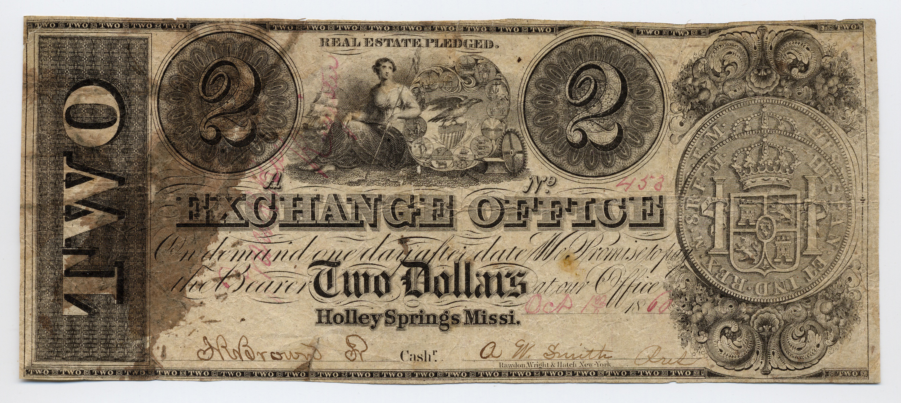 Exchange Office, “Exchange Office, Mississippi, Holley Springs, 1860, 2 dollars,” Omeka, accessed April 25, 2026, https://www.oldnote.org/omeka/items/show/74.