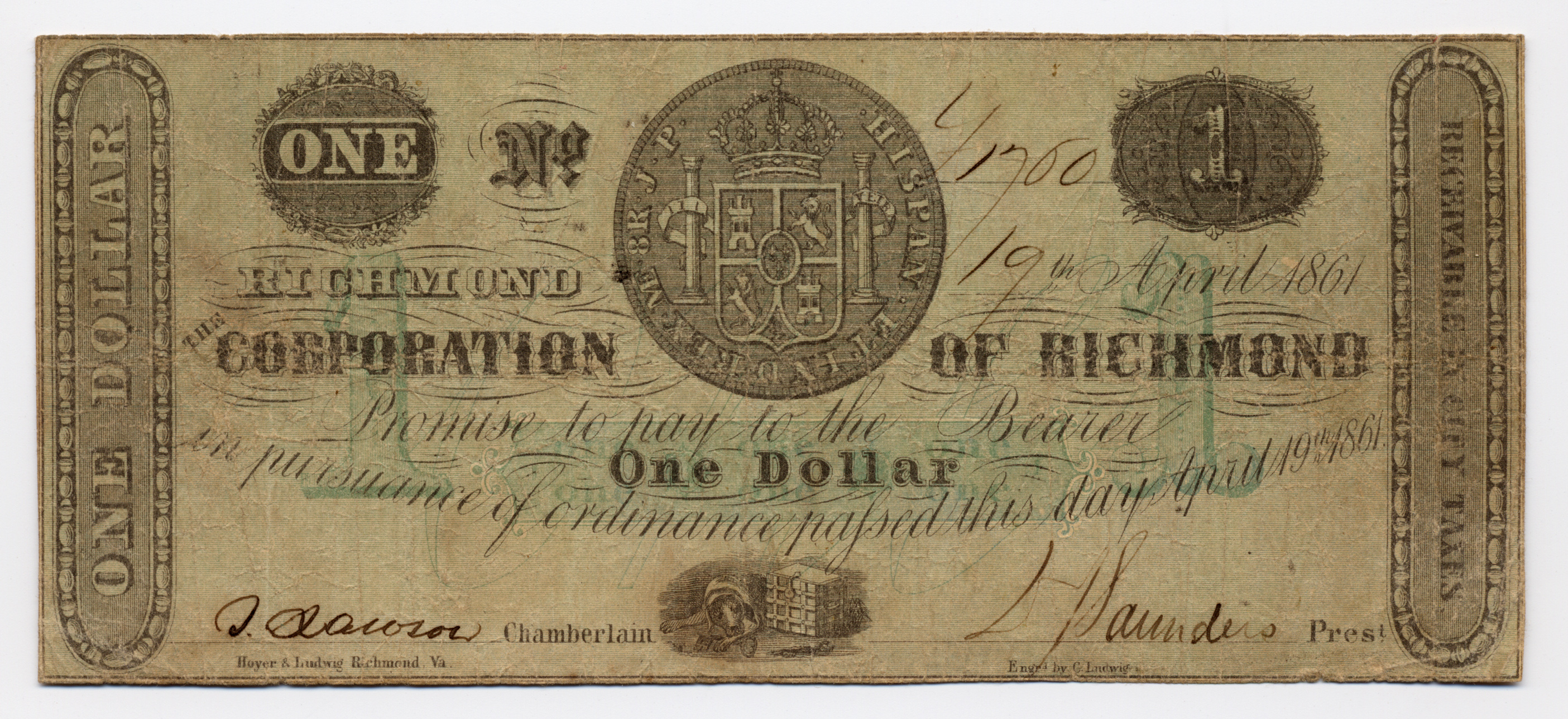 Corporation of Richmond, “Corporation of Richmond, Virginia, Richmond, 1861, 1 dollar,” Omeka, accessed April 25, 2026, https://www.oldnote.org/omeka/items/show/75.