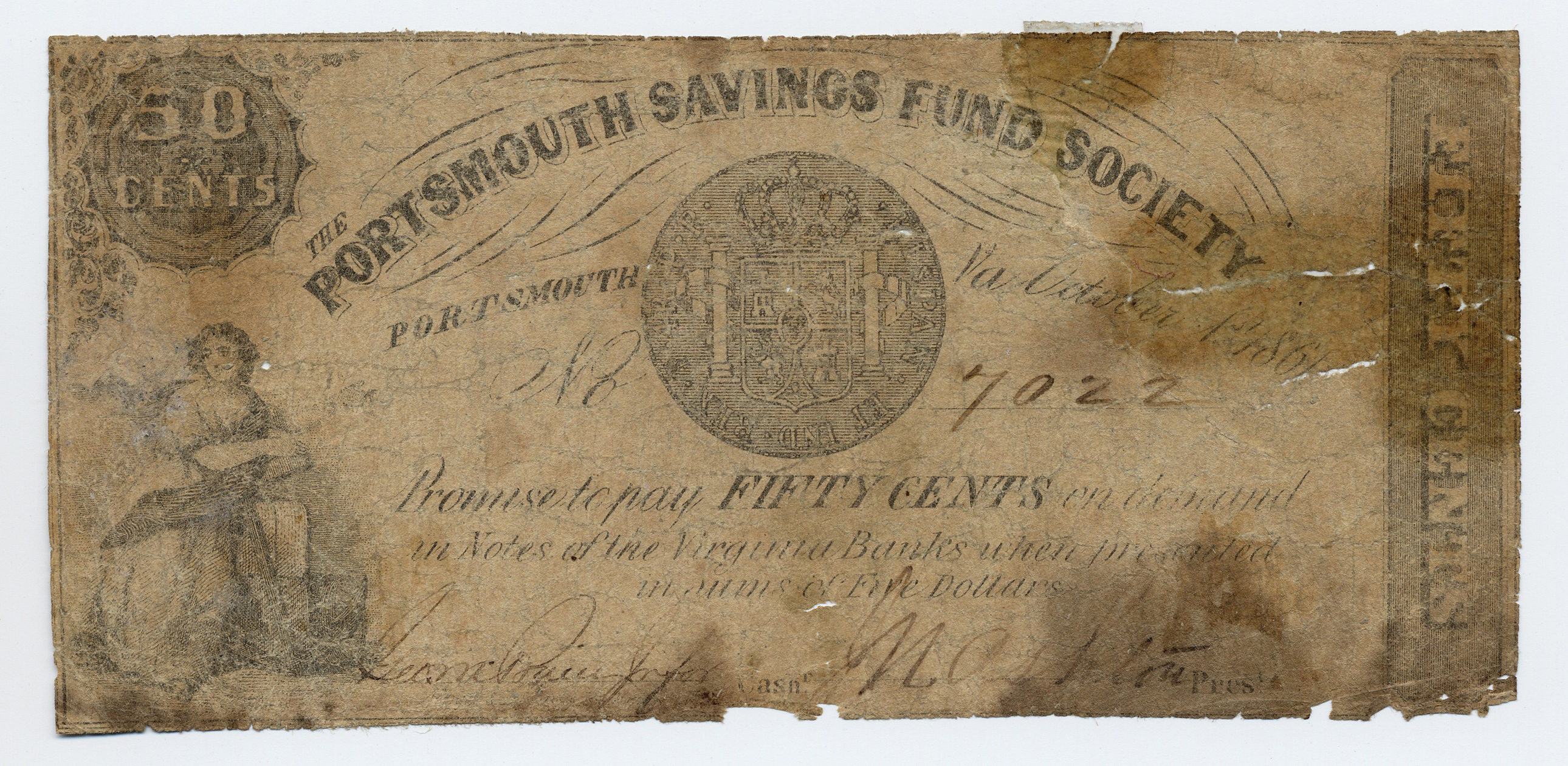 Portsmouth Savings Fund Society, “Portsmouth Savings Fund Society, Virginia, Portsmouth, 1861, 50 cents,” Omeka, accessed April 25, 2026, https://www.oldnote.org/omeka/items/show/82.