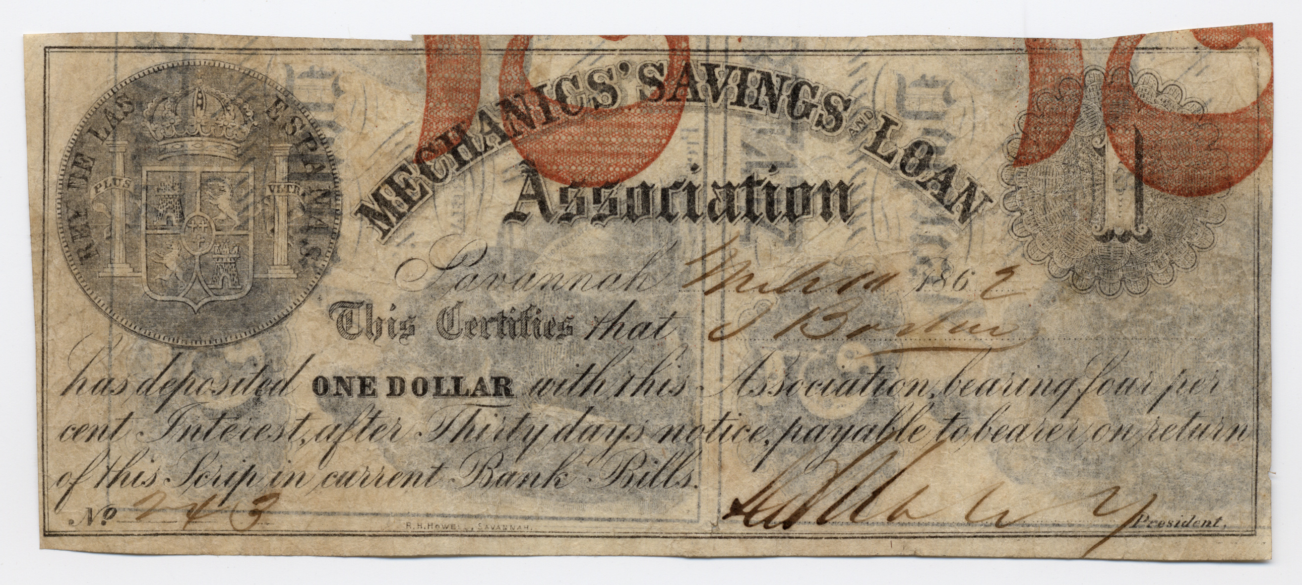 Mechanics Savings and Loan Association, “Mechanics Savings and Loan Association, Georgia, Savannah, 1862, 1 dollar,” Omeka, accessed April 25, 2026, https://www.oldnote.org/omeka/items/show/96.